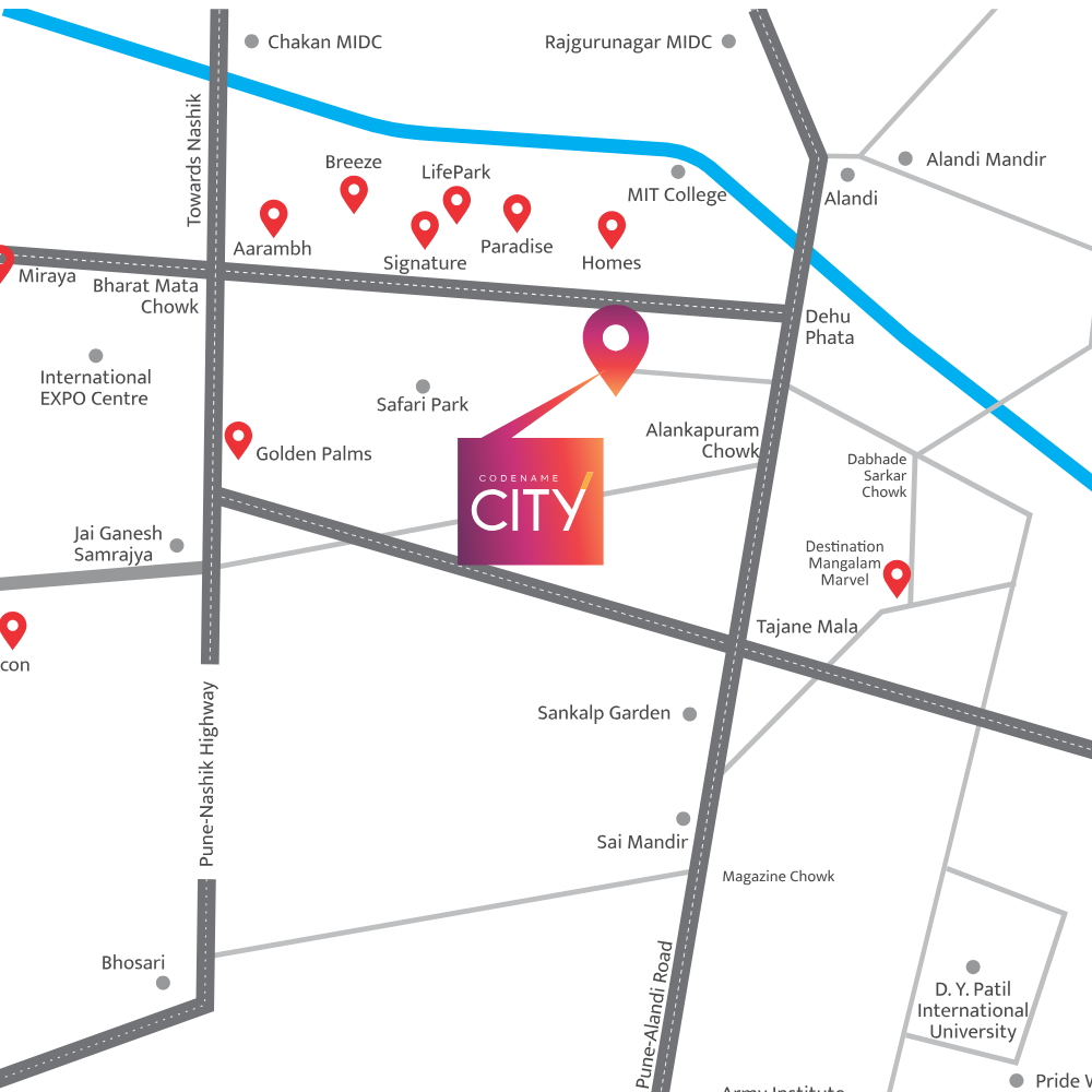 Where others are happy with a silver lining, you can envision life with golden lining at Codename Midas City. Offering 2 , 3 & 4 BHK luxurious homes, housed in towers and acres at Chovisawadi, Charholi Phata, Codename Midas City is truly a city in itself. Want a home close to greenery? How about , Sq.Ft of green space? Need to plan for the weekend? Excitement awaits in the + amenities spread across acre. At Codename Midas City, experience the gold standard of high-life, made possible with the Midas Touch Of Mangalam.